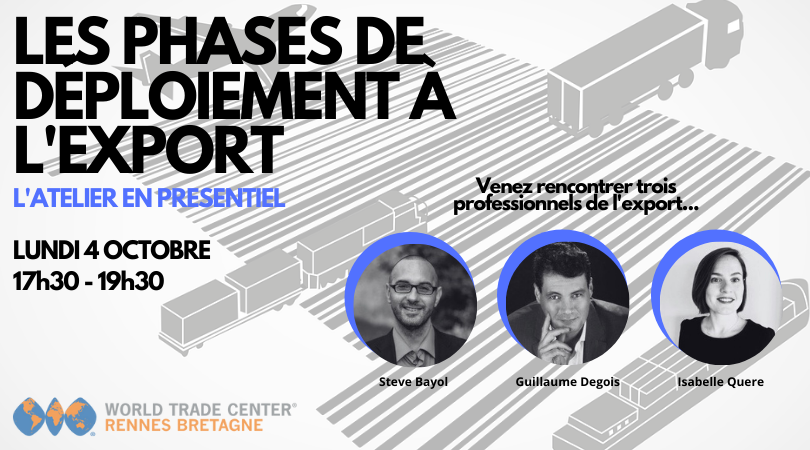 Suite à l’atelier de juin dernier, Les Phases de déploiement à l’export – une mise en bouche, nous avons retrouvé en présentiel au WTC Rennes Bretagne nos trois intervenants Steve BAYOL, Guillaume DEGOIS & Isabelle QUERE qui vous ont proposé un atelier sur les phases à prendre en compte pour un développement à l’international réussi.