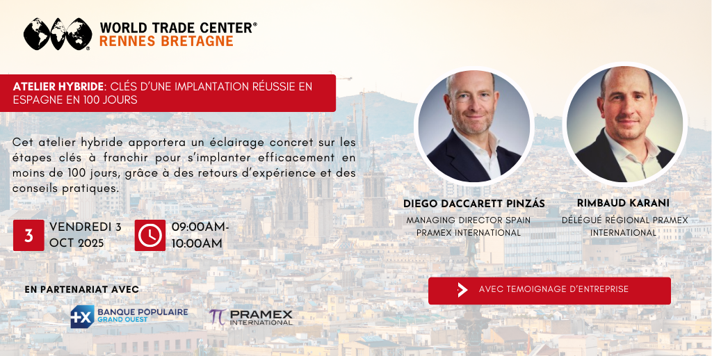 Le WTC Rennes Bretagne organise un atelier hybride le jeudi 3 octobre 2025 consacré aux étapes clés pour réussir une implantation en Espagne en moins de 100 jours. Cet échange apportera des conseils pratiques et des retours d’expériences concrets pour accompagner efficacement les entreprises dans leur développement international.