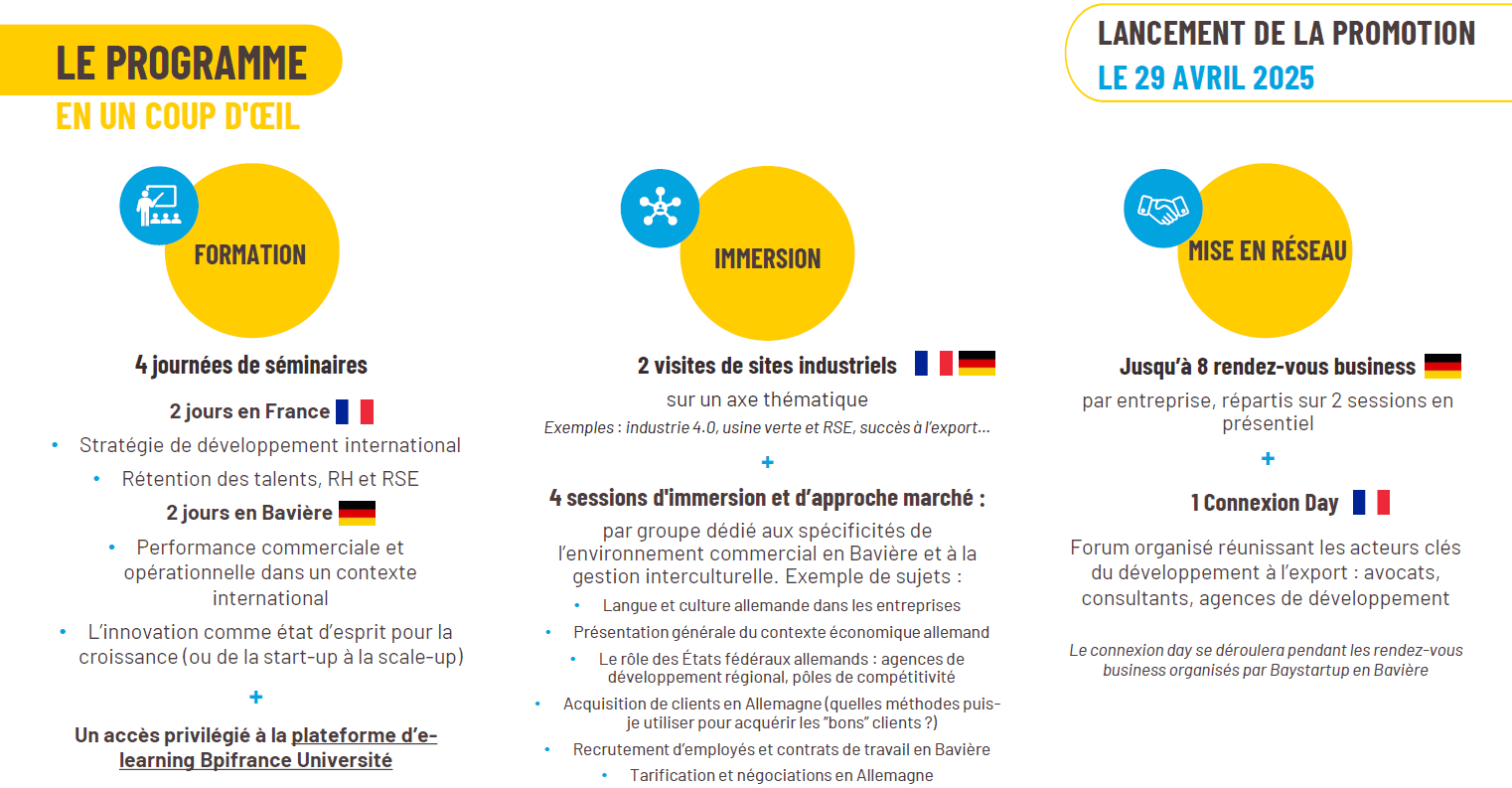 Lancé en partenariat avec le Consulat Général de France à Munich et Gründerland Bayern, ce programme vise à développer le business avec des entreprises bavaroises et renforcer la présence commerciale et industrielle en Allemagne.