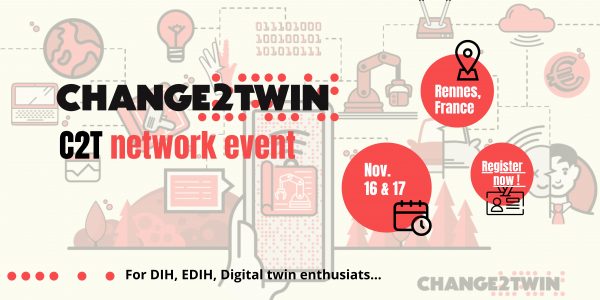 During this event DIHs/EDIHs will have the opportunity to learn about the outcomes of the project. Change2twin partners will present tools, use cases and lessons learned from the SMEs mentors. A workshop on Day 2, will be focused on the link between local authorities and (E )DIHs. Finally, we will discuss all together how to make a better use of the project results to create new Digital twins champions in Euope !