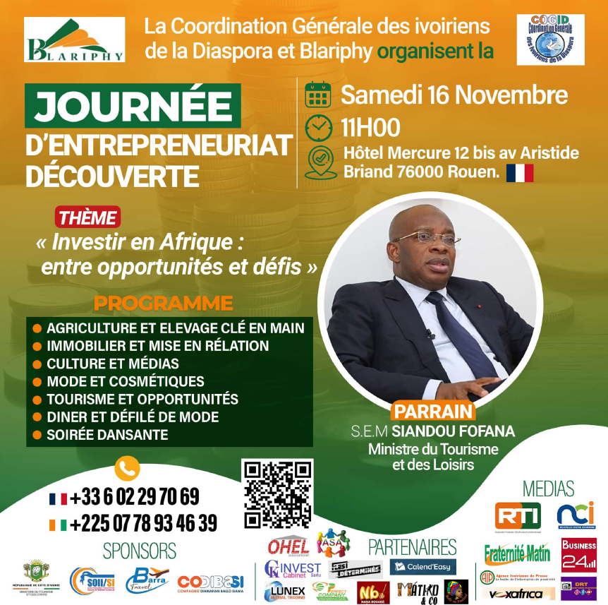 Cette première édition sous le thème “Investir en Afrique” est placée sous le parrainage de son excellence Siandou FOFANA Ministre du Tourisme et des Loisirs de côte d’ivoire avec comme invité d’honneur, Son Excellence Issiaka KONATE Consul géneral de la côte d’ivoire à Paris.