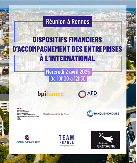 Le Medef Ille-et-Vilaine et ses partenaires, le Medef International, Business France, la Banque Mondiale, la Direction générale du Trésor, l’AFD et Bpifrance, vous invitent à une réunion sur les outils de financement des entreprises à l’international, le mercredi 2 avril 2025 à Rennes (Innoval, Rue Eric Tabarly, 35530 Noyal-sur-Vilaine).