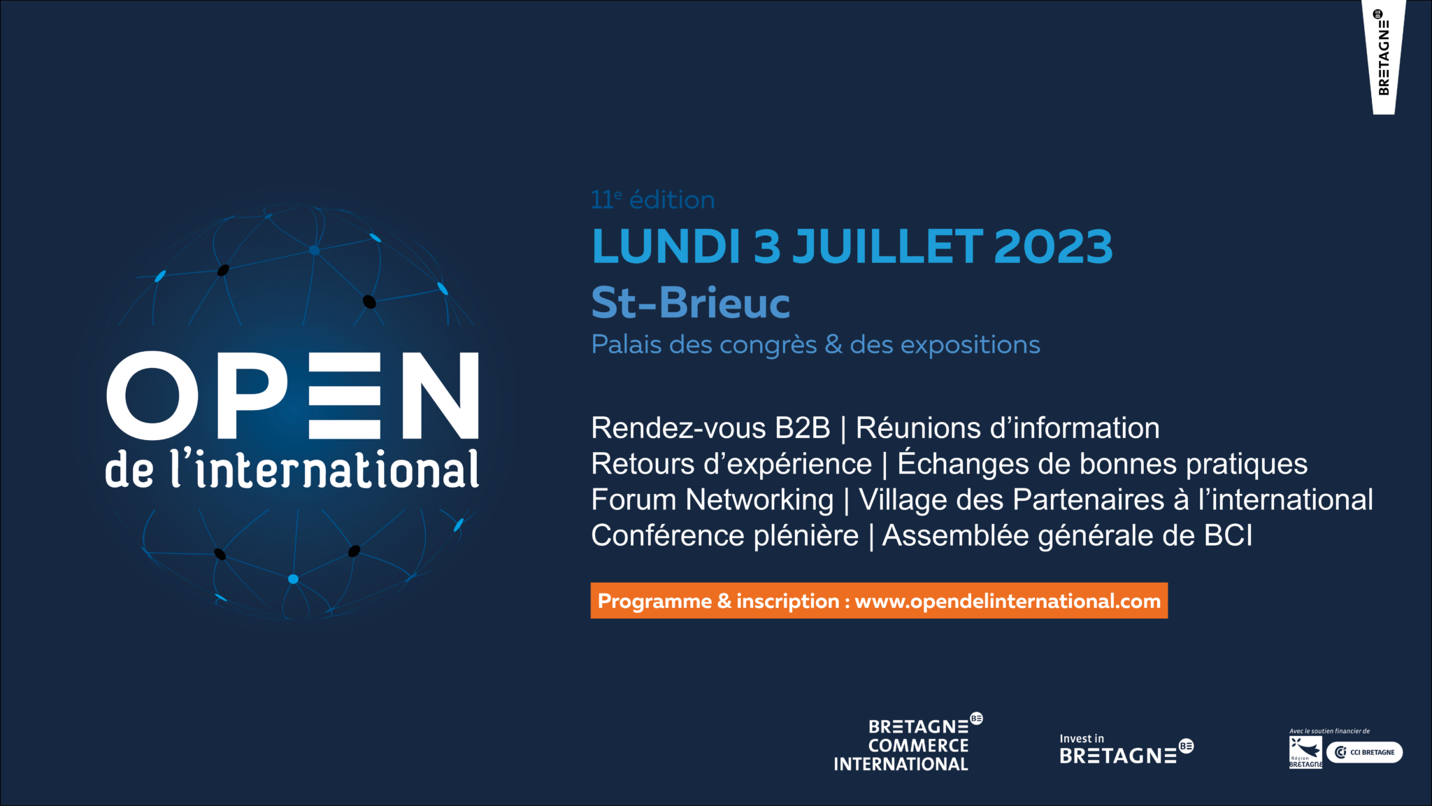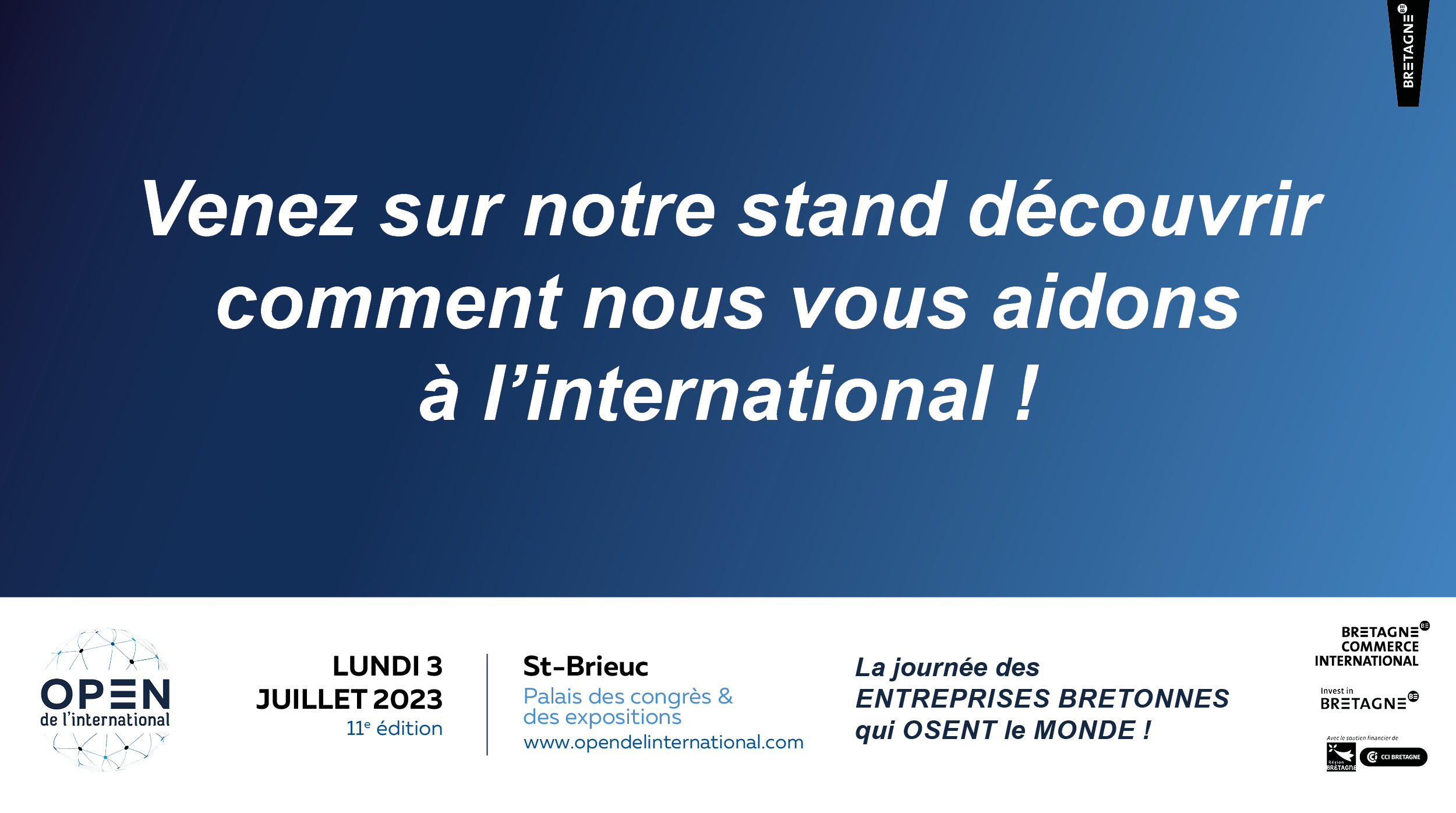 Le lundi 3 juillet 2023, Bretagne Commerce International organise la 11ème édition de l’OPEN de l’international au Palais des Congrès et des Expositions de Saint-Brieuc. Cette journée d’information et de networking dédiée à l’international s’adresse aux entreprises bretonnes, qu’elles débutent à l’international ou qu’elles soient déjà expérimentées sur les marchés étrangers.