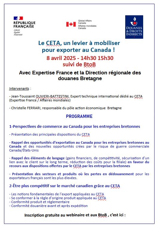 En partenariat avec le pôle d’action économique (PAE) des Douanes françaises de Bretagne, l’expert Technique International, Jean-Toussaint BATTESTINI présentera les démarches douanières et règlementaires à connaître et les outils interactifs à mobiliser en amont d’un projet d’export au Canada.