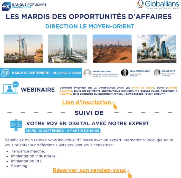 Banque Populaire Grand Ouest et TTE GULF – membre du réseau GLOBALLIANS vous invitent à un webinaire suivi de RDV individuels sur les opportunités d’affaires au Moyen Orient.