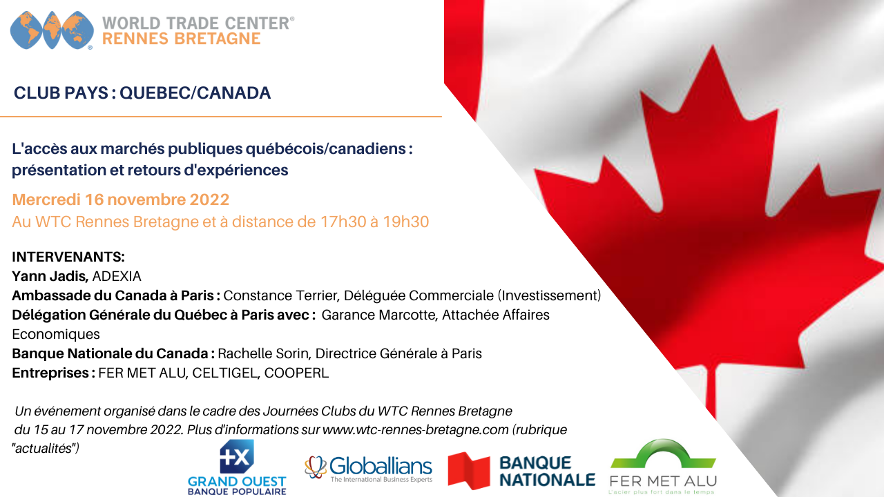 Dans le cadre de ses Journées Clubs, le WTC Rennes Bretagne a eu le plaisir d’organiser un webinaire sur le Québec/Canada : l‘accès aux marchés publiques québécois/canadiens : présentation et retours d’expériences. Nous avons eu le plaisir d’assister aux présentations de nos intervenants: