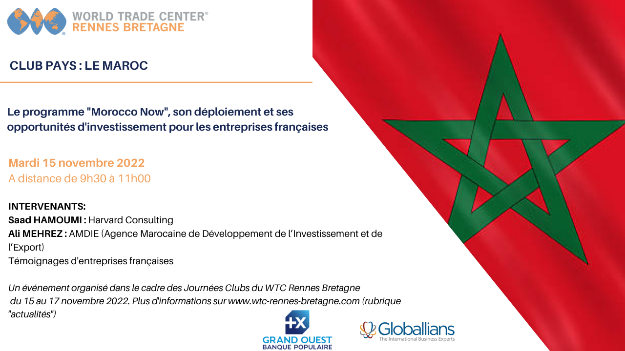 Dans le cadre de ses Journées Clubs, le WTC Rennes Bretagne a eu le plaisir d’organiser un webinaire sur le Maroc : le déploiement du programme Morocco Now et ses opportunités d’investissements pour les entreprises françaises . Nous avons eu le plaisir d’assister aux présentations de nos intervenants: