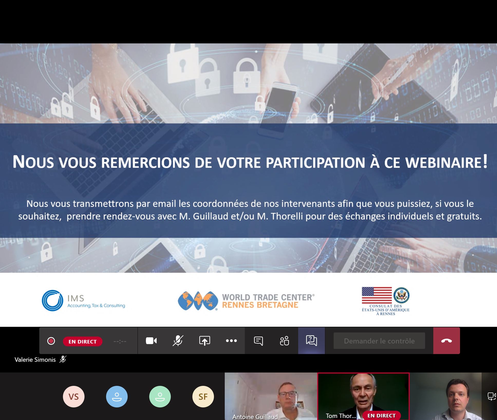 Ce webinaire était organisé par International Management Solutions, Inc. dans le cadre des activités du Club USA du World Trade Center Rennes-Bretagne avec le soutien de Thorelli & Associates et la participation spéciale du Consulat des Etats-Unis pour le Grand Ouest. L’objectif du webinaire était de comprendre les aides disponibles au niveau fédéral, ainsi que les mesures à mettre en place pour traverser la période de crise du Covid-19 tout en assurant la survie et développement de son entreprise aux Etats-Unis.