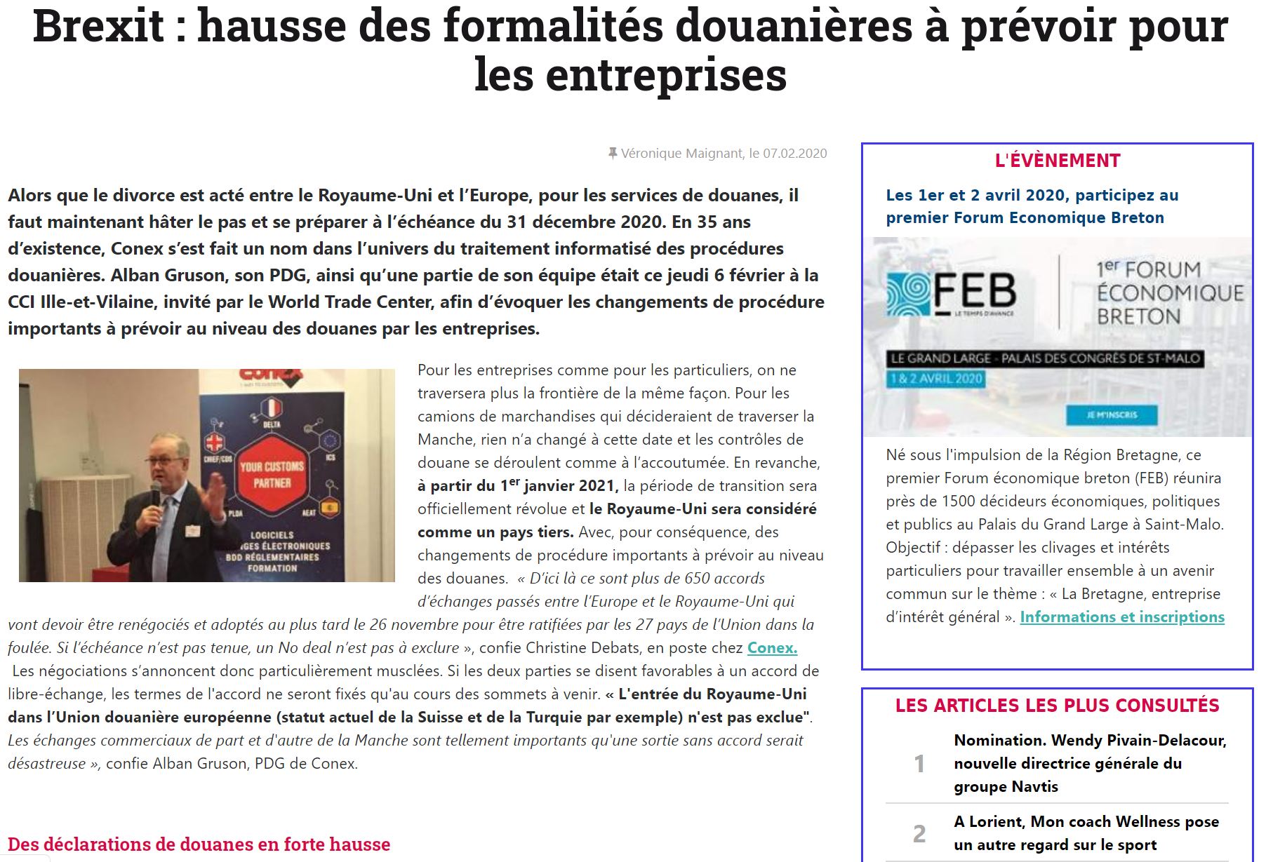 L’entreprise CONEX, leader du marché en solutions logicielles spécialisées dans la gestion des formalités douanières, a présenté les conséquences douanières du BREXIT pour l’importation et l’exportation de produits depuis ou vers le Royaume-Uni.